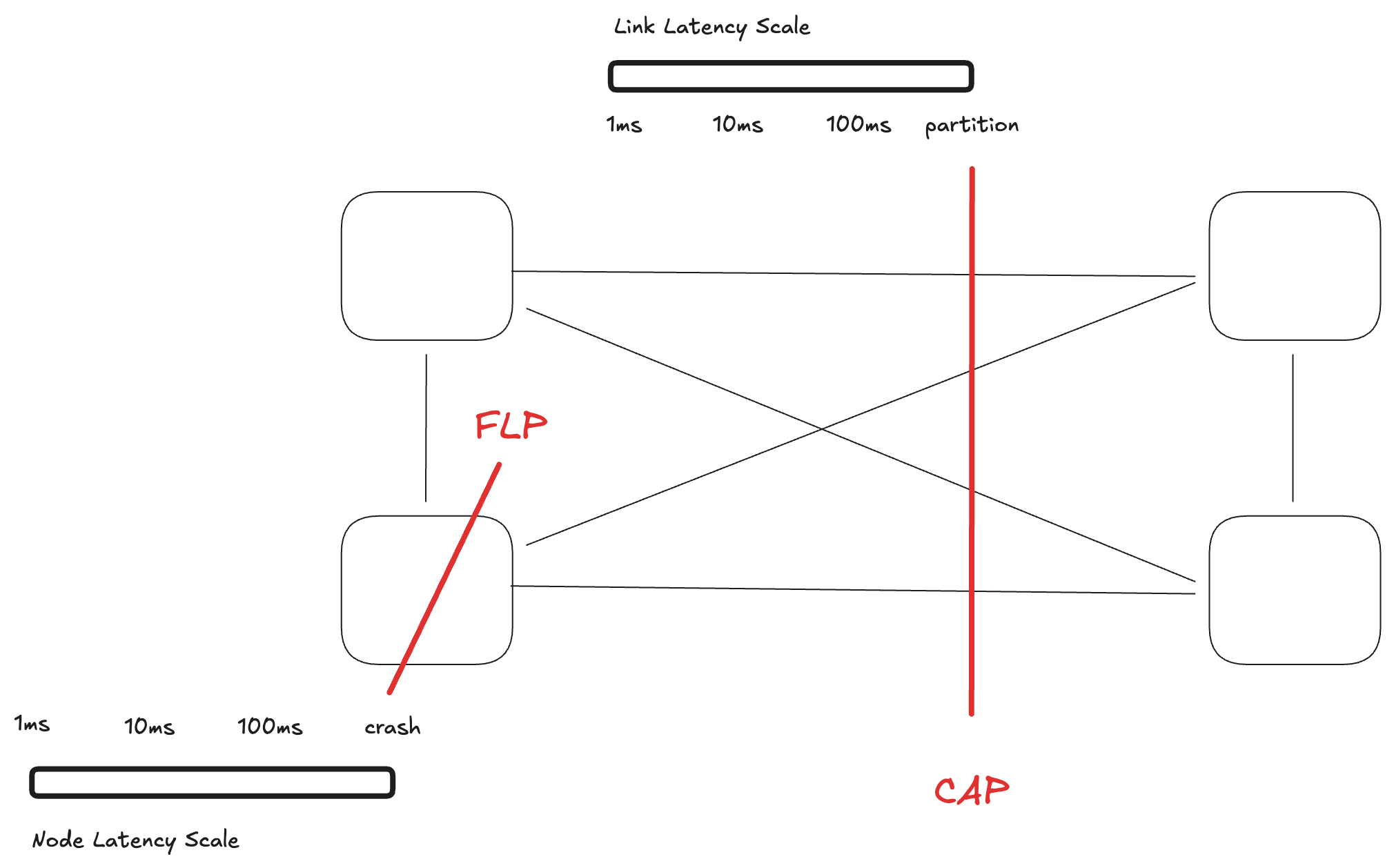 Unreliability indeed sounds like a qualitative issue, but notice how it’s paired with asynchronicity. What is asynchronicity if not latency…? If FLP can’t distinguish slow from crashed, that also means it can’t distinguish “a little slow” from “extremely slow”!