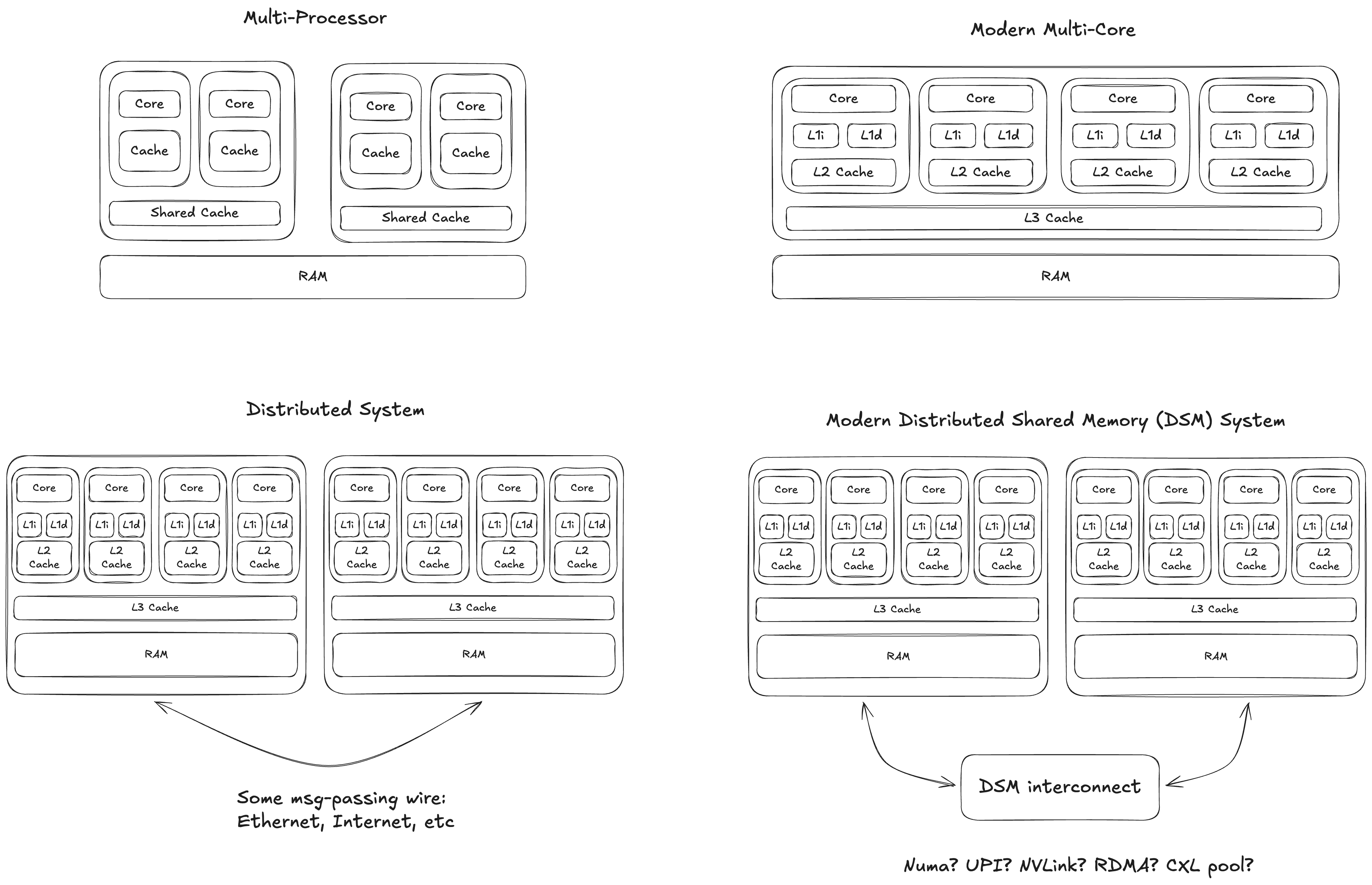What is a distributed system? Every definition I’ve ever come across always has me eventually realizing “wait a second… this also applies to multiprocessors!”. The goal of this article is to have fun analyzing multicore and distributed computing, and realize that they might not be as qualitatively different as people make them out to be.